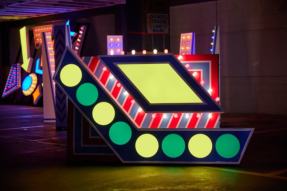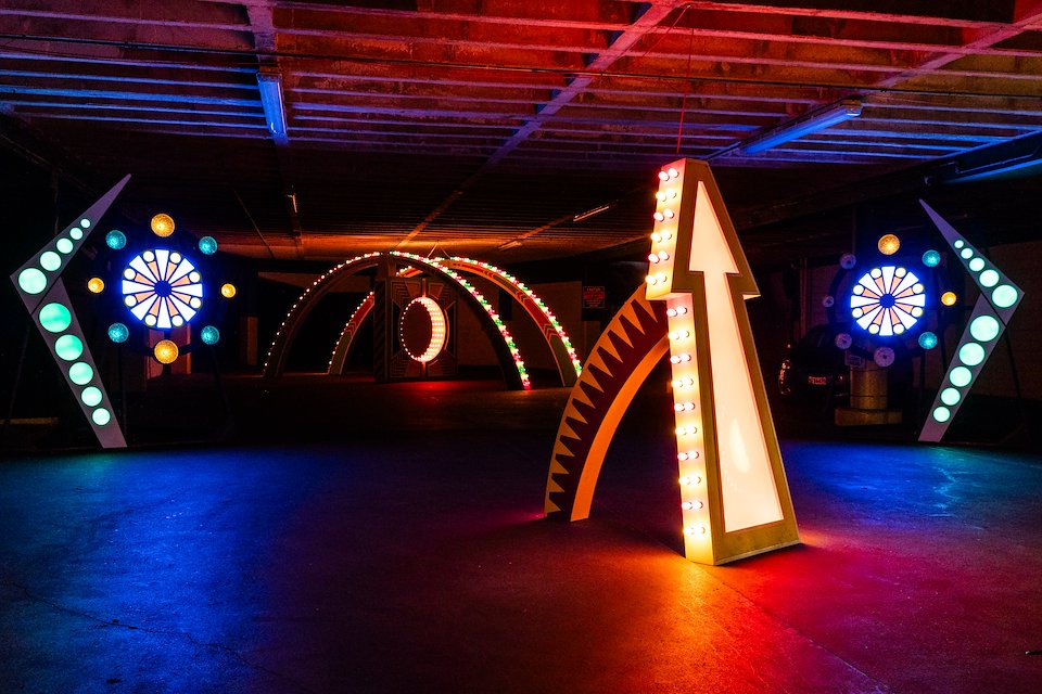 The Blinkatorium is a series of free standing sculptures inhabiting a 5,000 square foot parking garage, and evokes the aesthetic of a traveling carnival. All pieces are constructed using colorful LED and incandescent lighting, along with vibrant stripes and graphic patterns, a cornerstone of Pennington’s body of work.