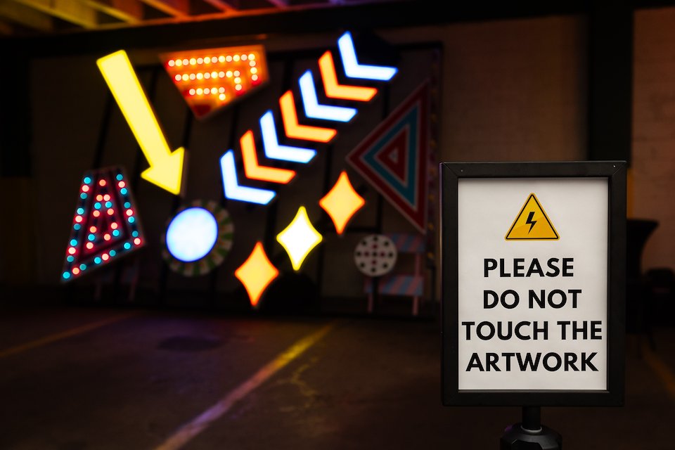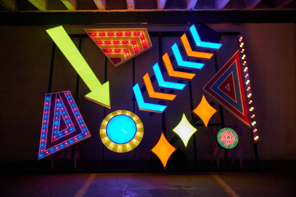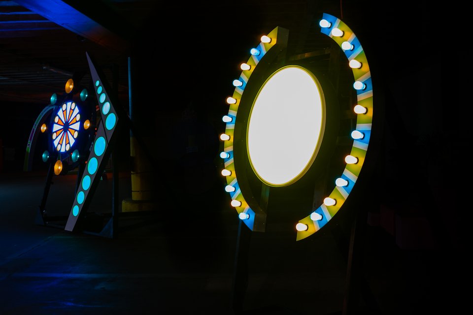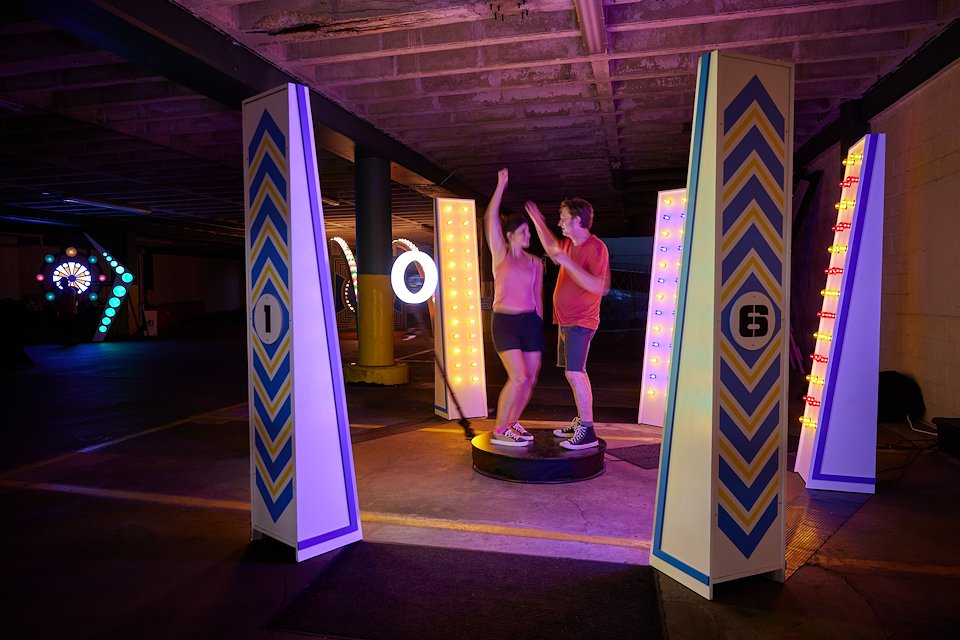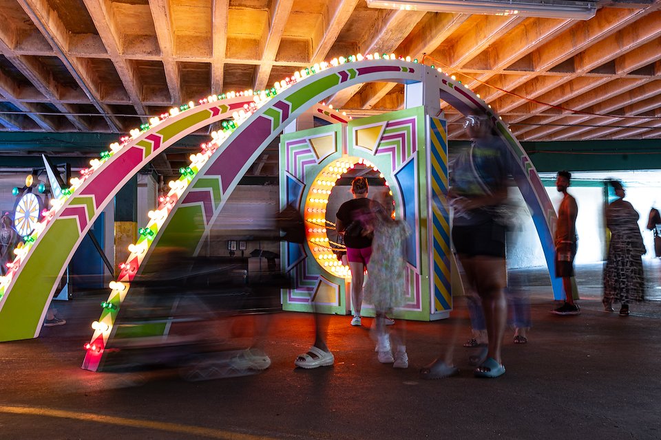 Featured was an updated rendition of “The Spider” (originally constructed in 2016 and reworked for this project), a pair of lit circular disks flanked by large chevrons on easels titled, “The Gates”(2023), and Pennington’s latest 2024 oversized installation titled, “The Billboard”. Pennington also launched a new, interactive piece created in conjunction with Side A Photography, in which participants danced in the center of a ring of blinking light columns, and received a 20 second, rotating video of their experience.