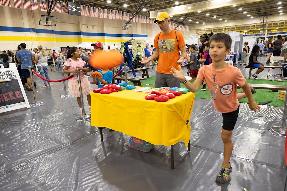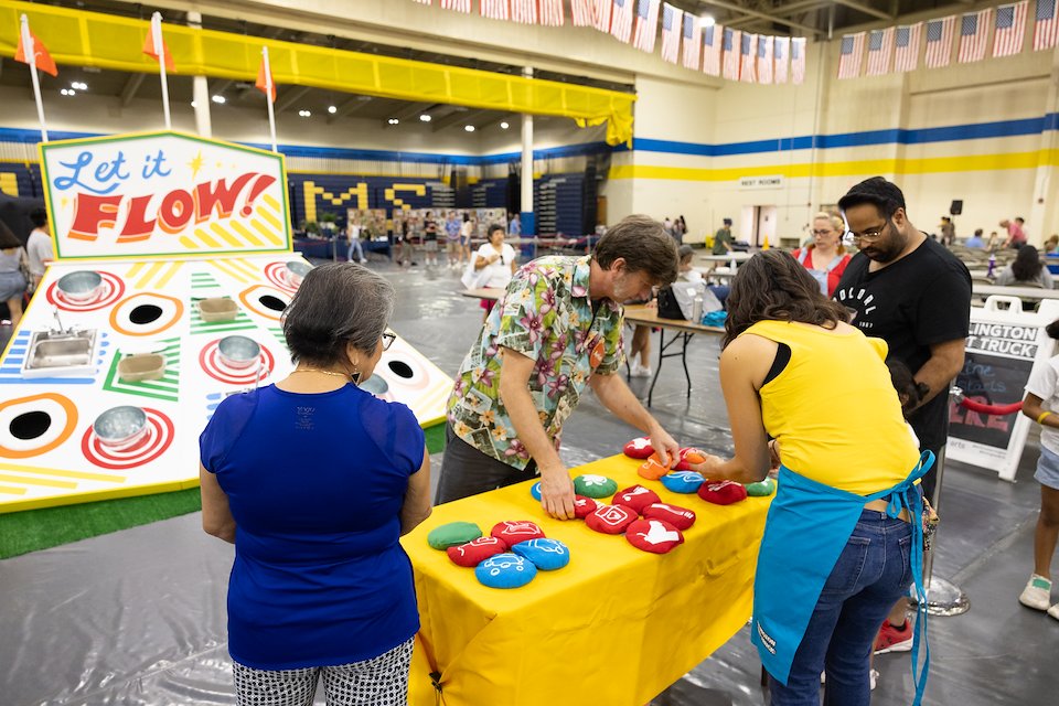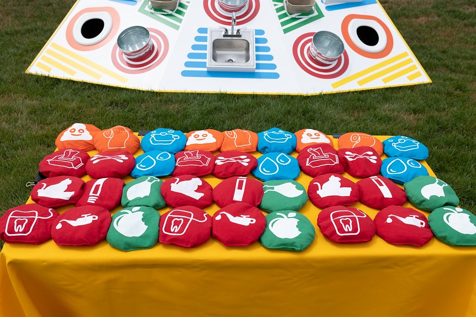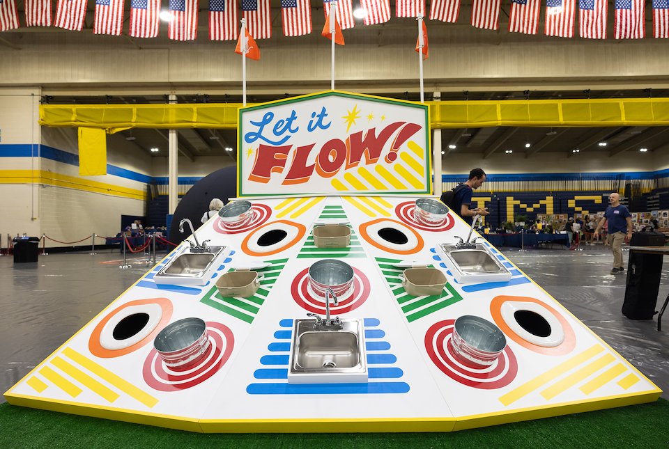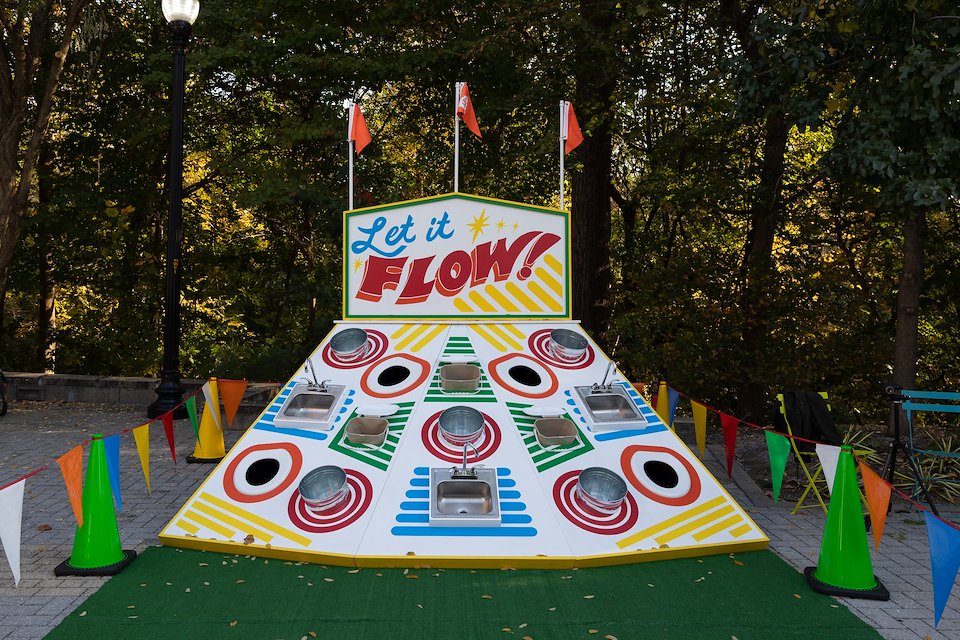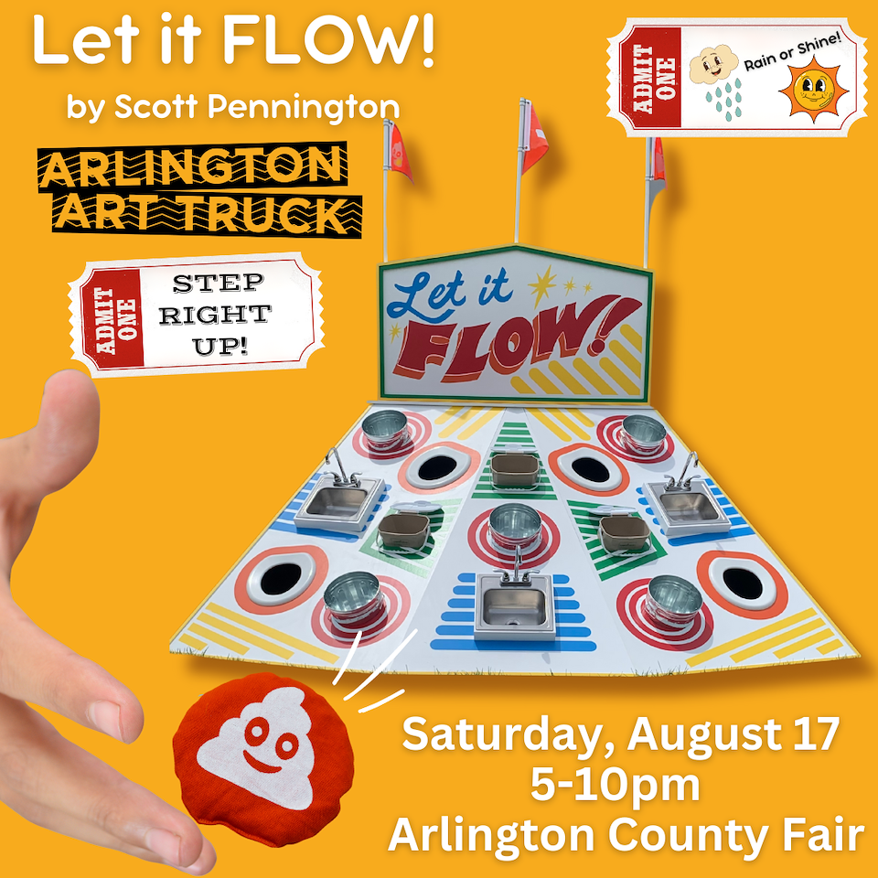 Let It Flow! is a carnival style bean bag toss game designed by Scott Pennington for the Arlington Art Truck 2024 season. Partnered with the Arlington Water Pollution Control Plant, the game was designed to educate county residents about proper waste disposal the avoid interfering with the county water treatment process. Game players learned where to discard items safely by tossing colorful bean bags with images including dental floss, cotton swabs, cigarette butts, cat litter, human waste, food scraps, toilet paper, water and flushable wipes into color coded targets. The targets included a waste basket, sink, food scrap recycling bin and a toilet. The game accommodates 2-3 players at a time and toured through Arlington County, VA, stopping at various public events including street festivals and farmers markets throughout the fall of 2024.